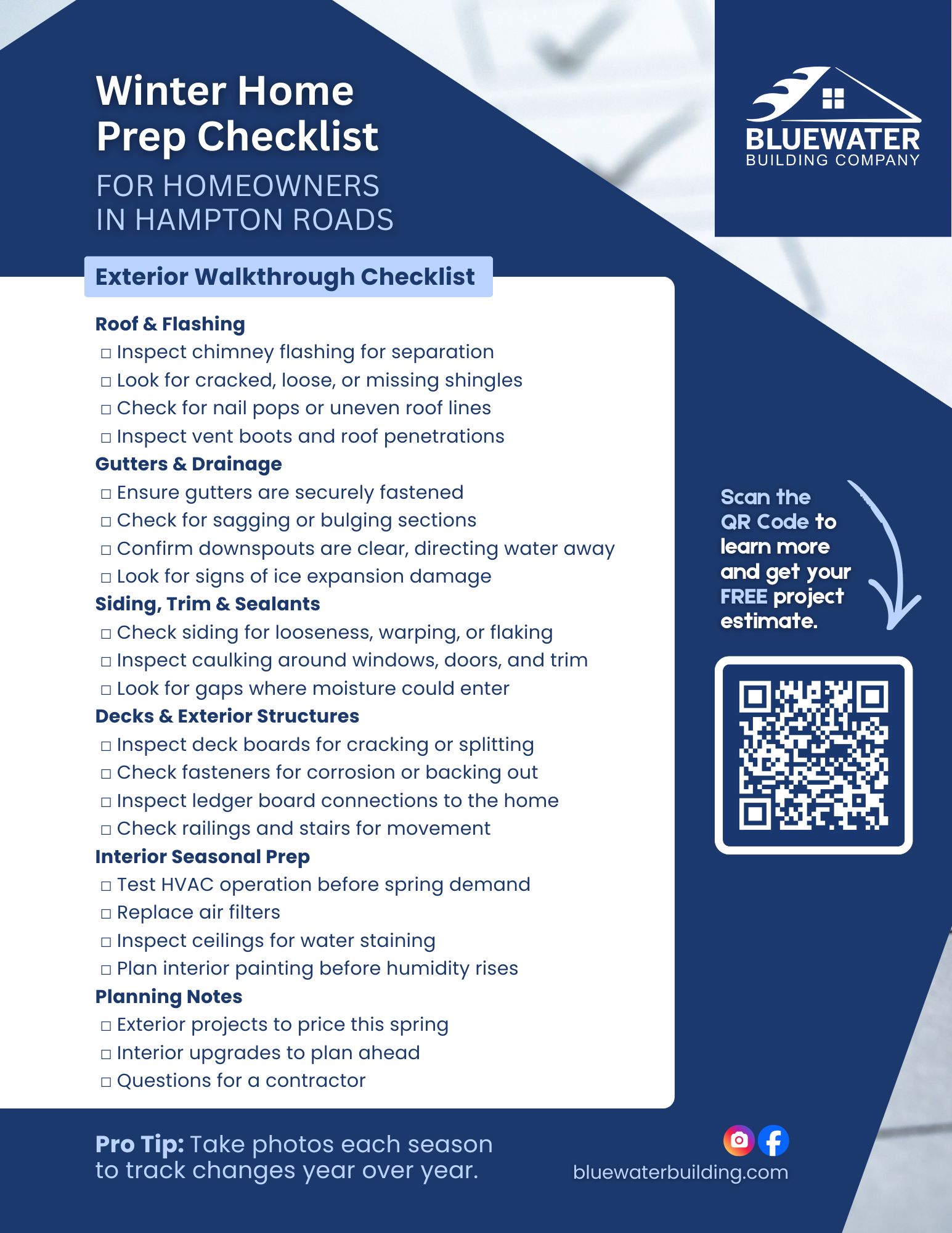 Built for Hampton Roads homes, this Winter Home Prep Checklist helps homeowners identify early warning signs of moisture, weather exposure, and seasonal wear, so you can plan smarter and stay ahead of repairs.